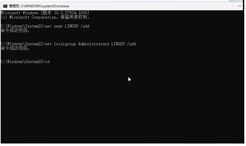 2、然后在命令提示符下依次输入以下命令,来创建本地用户