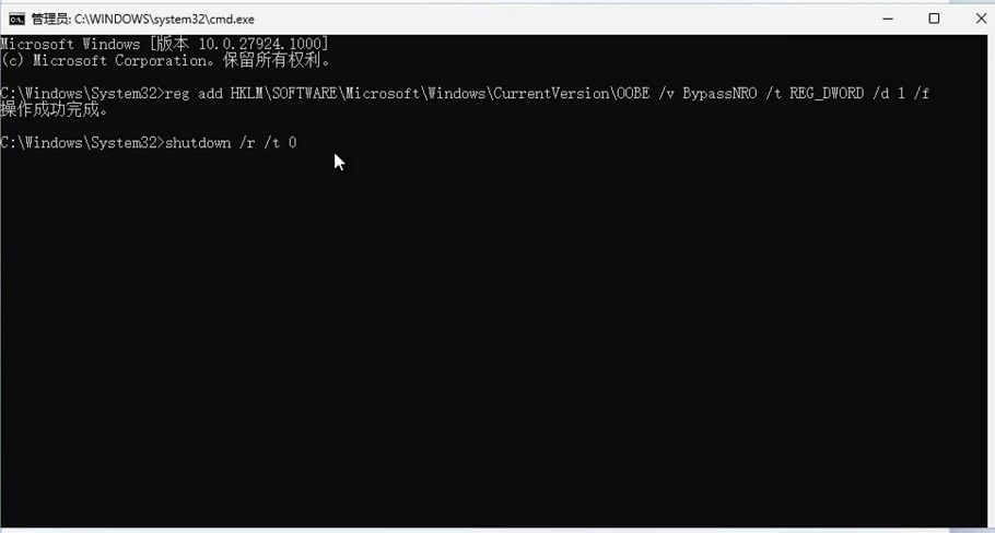reg add HKLM\SOFTWARE\Microsoft\Windows\CurrentVersion\OOBE /v BypassNRO /t REG_DWORD /d 1 /f