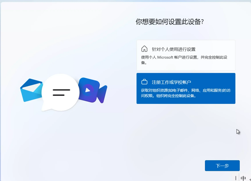 针对 Windows 11 专业版、企业版,我们可以在安装的过程中,选择“为工作或学校设置”选项,而不是“为个人使用设置”,从而跳过检查。
